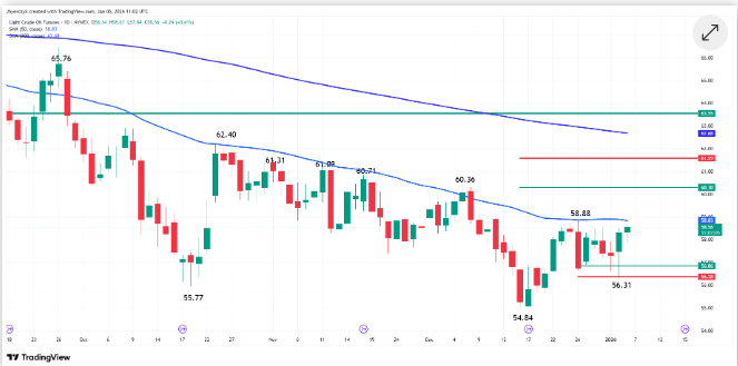 اختراق مستوى 58.88 دولارًا بثقة سيضع السوق في الجانب القوي من مؤشري الاتجاه. إذا ولّد هذا الارتفاع زخمًا صعوديًا كافيًا، فمن المتوقع أن يمتد الارتفاع إلى مستوى 50% المتوسط عند 60.30 دولارًا وقمة تأرجح أخرى عند 60.36 دولارًا. في تمام الساعة 11:49 بتوقيت غرينتش، يتم تداول العقود الآجلة للنفط الخام الخفيف عند 58.58 دولارًا، بارتفاع قدره 0.26 دولارًا أو 0.45%.