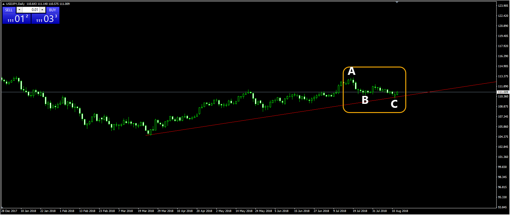 دخل الزوج دولار / ين في حركة تصحيحية استمرت حتى وصل السعر لمستوى 110.102، وكانت الحركة التصحيحية عبارة عن حركة مركبة مكونة من ضلعين كما هو مبين من الرسم. تعتبر هذه الفرصة للشراء أحد أفضل فرص التداول نظراً إلى أنها حركة تصحيحية مركبة، وأنها انتهت بالقرب من مؤشر المتوسط المتحرك.