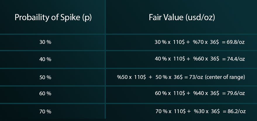 - العائد المتوقع من المستويات المرتفعة يصبح سلبيًا، ليس لأن الاتجاه هابط، بل لأن معادلة المخاطرة إلى العائد غير متوازنة. هذا في حالة دمج احتمالات التحليل الفني مع احتمالات التحليل الاقتصادي. ولكن هناك مدرسة أخرى للتقييم لا تعتمد بالكُلية على التحليل الفني في المُعادلة. ولذلك تكون القيمة العادلة للفضة في هذه الحالة محتلفة بعض الشيء.