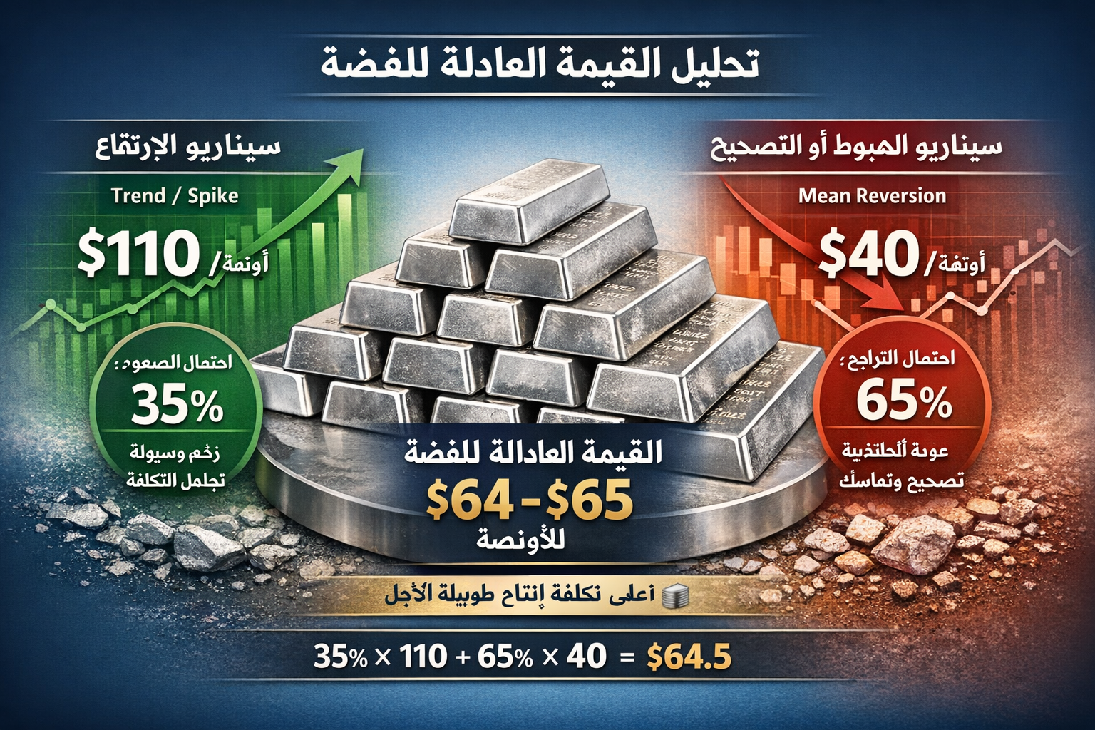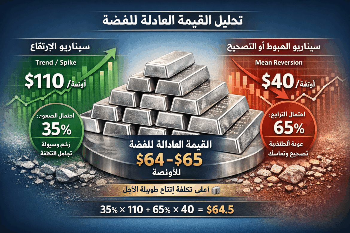 القيمة العادلة المقبولة اليوم (مع مراعاة العوامل الأساسية والتقلبات الدورية) ستكون: ≈ 75-85 دولارًا للأونصة يعكس هذا النطاق التكلفة الأعلى عند 36 دولارًا للأونصة، ارتفاعًا محتملاً في السعر قرب مستويات السوق الحالية (حوالي 110 دولارات للأونصة)، واحتمالية عودة الفضة إلى مستوياتها الأساسية بدلًا من بقائها عند مستويات قياسية مرتفعة.